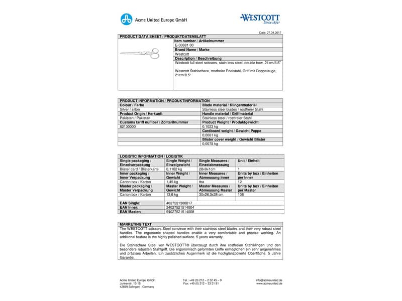 Le forbici in acciaio Steel di WESTCOTT® conquistano con le loro lame asimmetriche diritte in acciaio inox e l’impugnatura in acciaio particolarmente robusta. Le impugnature ergonomiche permettono di svolgere lavori di alta precisione. Un ulteriore elemento degno di nota è la superficie levigata. Garanzia di 5 anni.