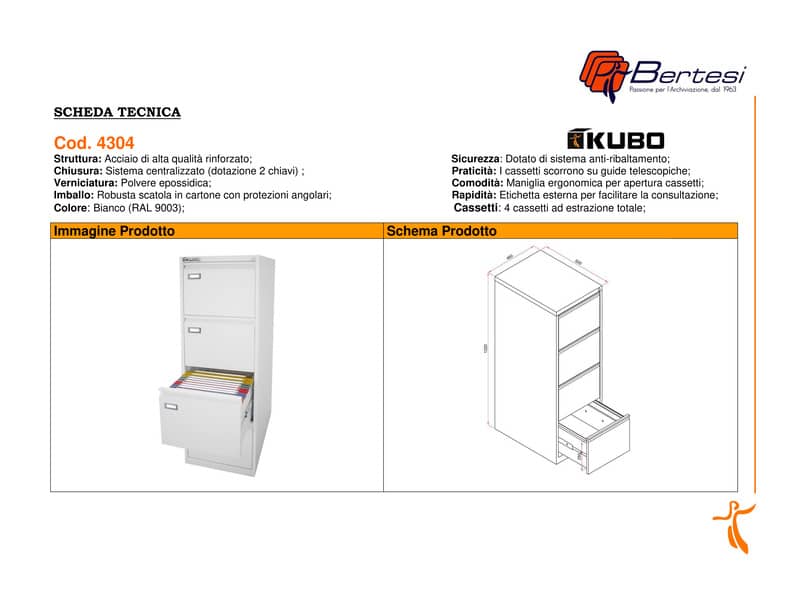 Classificatore in metallo di spessore KUBO 0,9 mm. (struttura) e 0,7 mm. (cassetti). Robusto e sicuro, con maniglia ergonomica e sistema antiribaltamento che impedisce l'apertura simultanea di più cassetti. Modello a 4 cassetti - colore bianco. Portata max. di ciascun cassetto 30 Kg.; sistema di chiusura centralizzato con 2 chiavi in dotazione e porta etichette in plastica posizionato su ogni cassetto.Dotati di guide telescopiche ad estrazione totale, i cassetti scorrono con estrema facilità e silenziosità. Cassetti adatti a contenere cartelle sospese con interasse 38 cm., 39 cm e 33 cm (tramite barra supplementare inclusa). Verniciatura con polveri epossidiche. Rispondono alle norme europee di sicurezza e sono dotati di marchio TÜV - GS. Garanzia 5 anni per vizi di fabbricazione (cassetti testati per 80.000 cicli di apertura/chiusura).Consegnati montati con imballo molto resistente su singoli pallet.