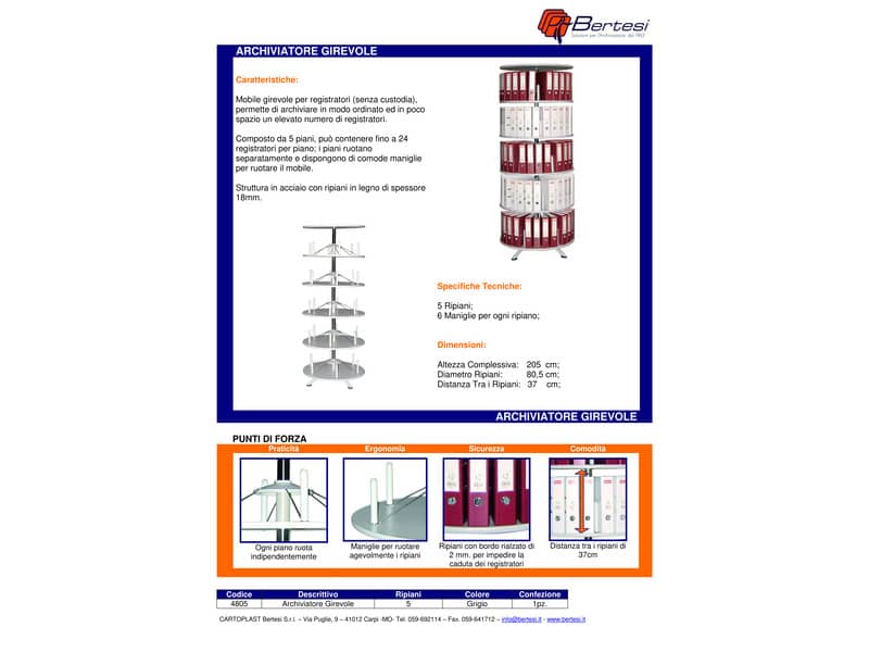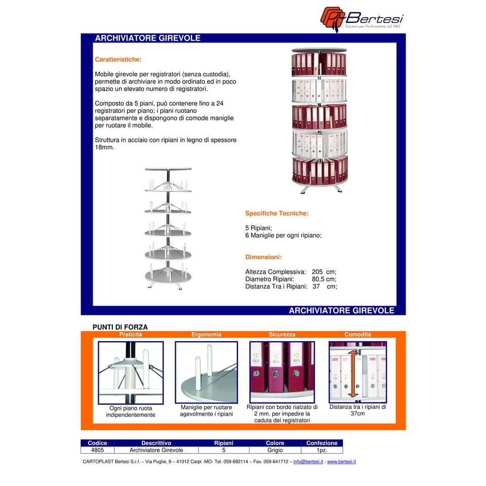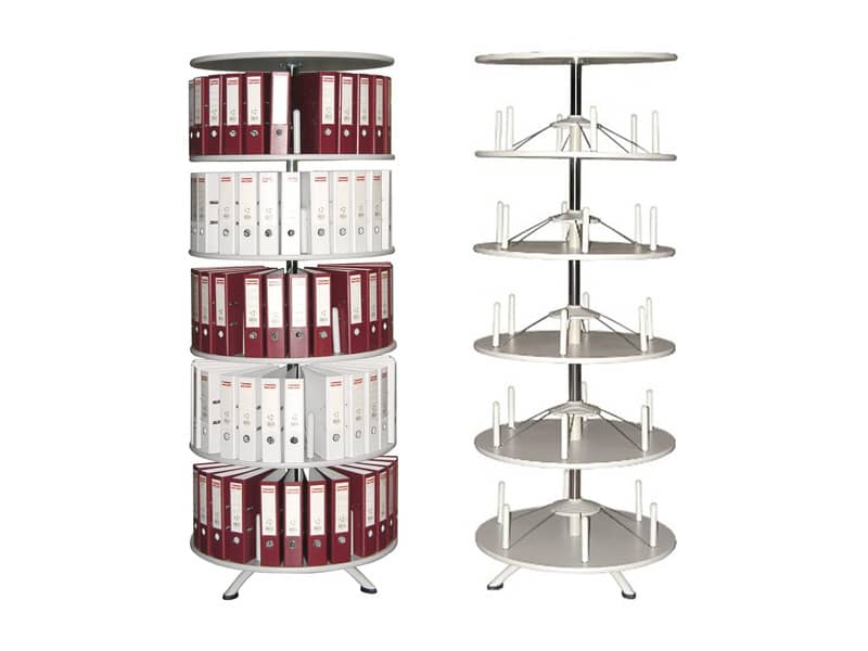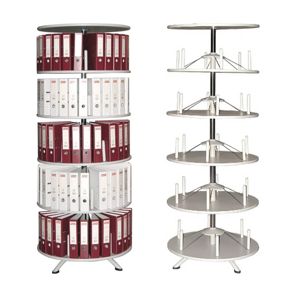 Archivio girevole per registratori senza custodia realizzato in acciaio con ripiani in legno, versione a 5 ripiani. Può contenere fino a 24 registratori dorso 8 cm. per piano. Adatto sia per registratori f.to commerciale sia per f.to legale. Ogni piano ruota autonomamente grazie ad apposite maniglie. Piani in legno di spessore 18mm con bordo rialzato di 2 mm. per impedire l’involontaria caduta dei registratori. Distanza tra i piani 370 mm. Diametro 805 mm. Altezza: 205 cm. Montaggio semplice e veloce grazie alle istruzioni allegate.