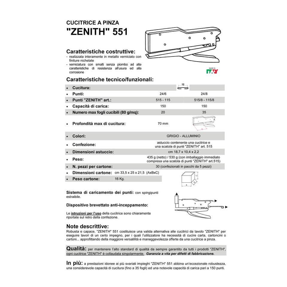 Cucitrice interamente in metallo. Collaudata singolarmente e garantita a vita per difetti di fabbricazione. Capacità di carica 150 punti. Cuce a punto chiuso fino a 20 fogli con punti 24/6 e fino a 35 fogli con punti 24/8. Spingi punti estraibile. Dispositivo brevettato anti-inceppamento.