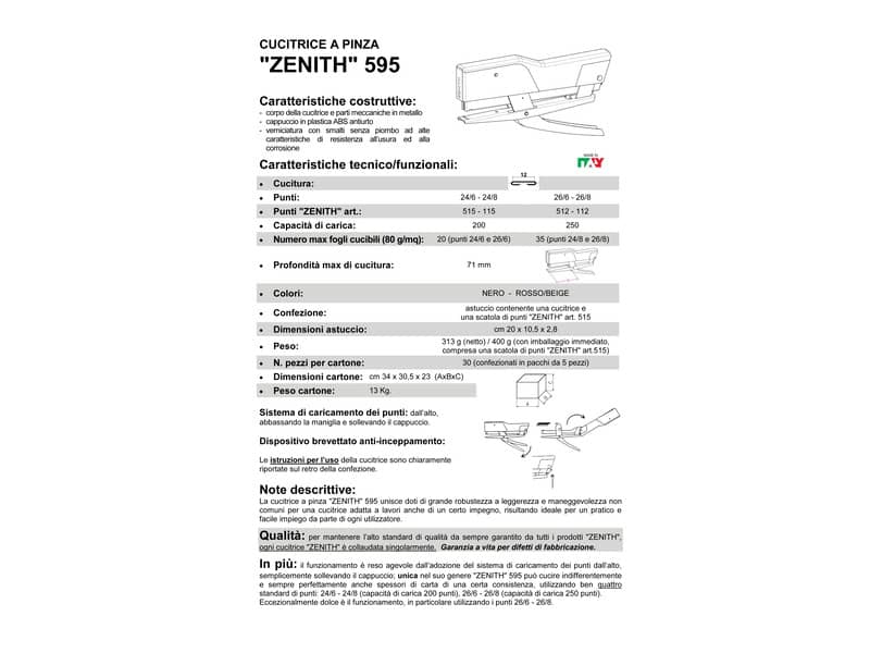 Cucitrice con corpo e parti meccaniche in metallo e cappuccio in plastica ABS antiurto colorato. Verniciatura con smalti senza piombo, altamente resistente all'usura ed alla corrosione. Collaudata singolarmente e garantita a vita per difetti di fabbricazione. Capacità di carica 200-250 punti. Cuce a punto chiuso fino a 20 fogli con punti 24/6 e fino a 35 fogli con punti 24/8. Caricamento punti dall'alto. Dispositivo brevettato anti-inceppamento.