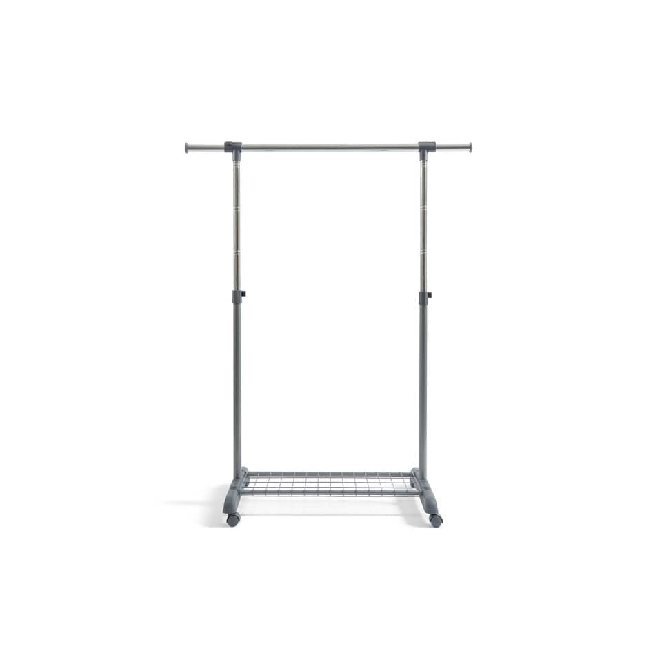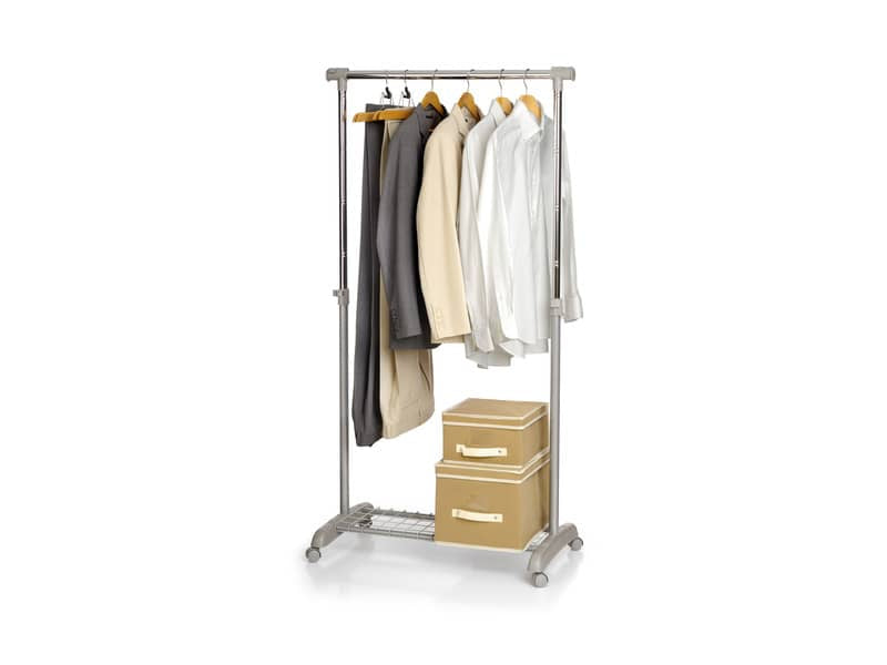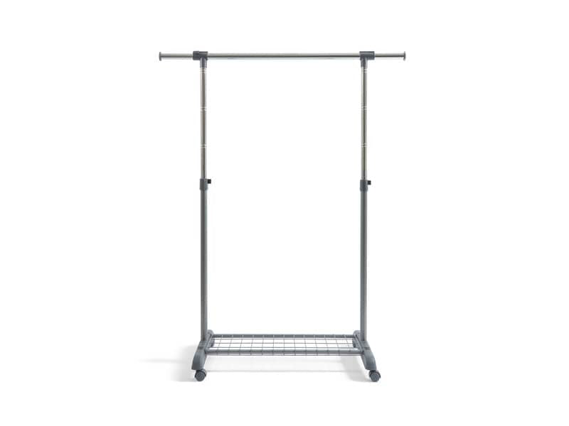 Appendiabiti multiuso Gastone ad una barra e base con ruote, appendici laterali estraibili. Si assembla senza utilizzo di attrezzi. Colore grigio cenere. Altezza e larghezza sono regolabili. Portata 25 kg. Dimensioni LxPxh: 88-138x44x94-166 cm.
