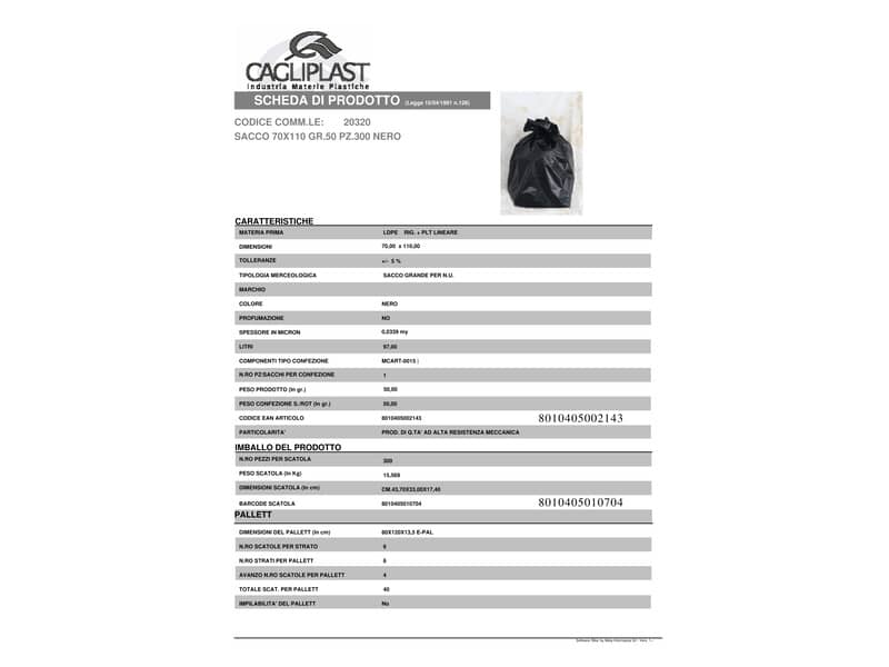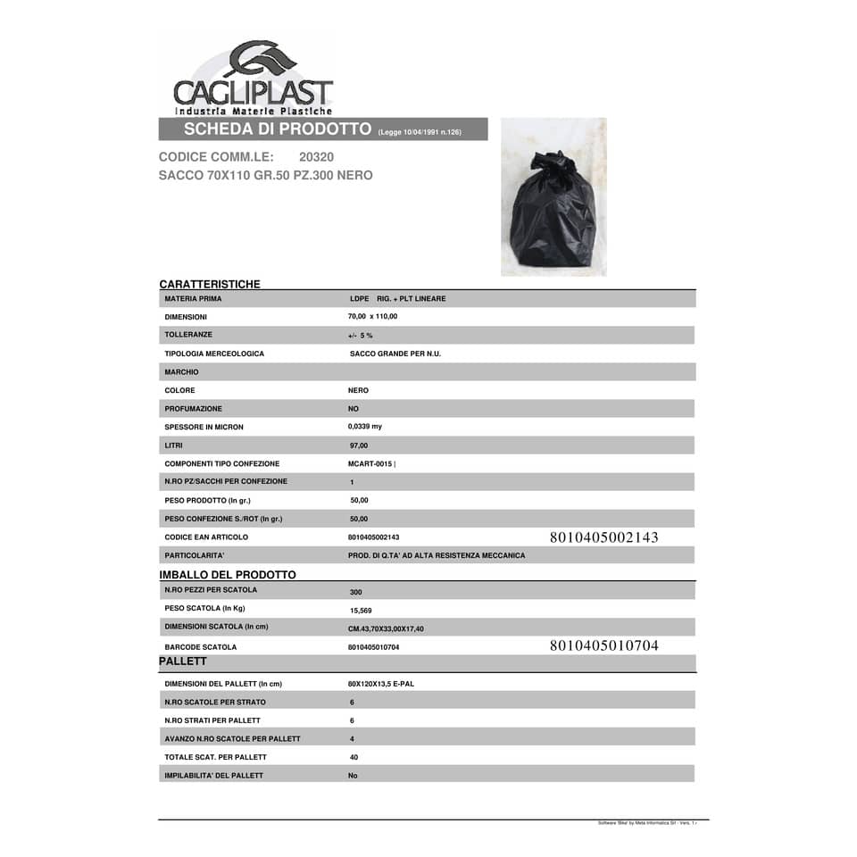 Sacco nero in polietilene rigenerato 70x110 cm, 50 gr, spessore 33 my e capacità 97 l, in cartone da 300 pezzi.