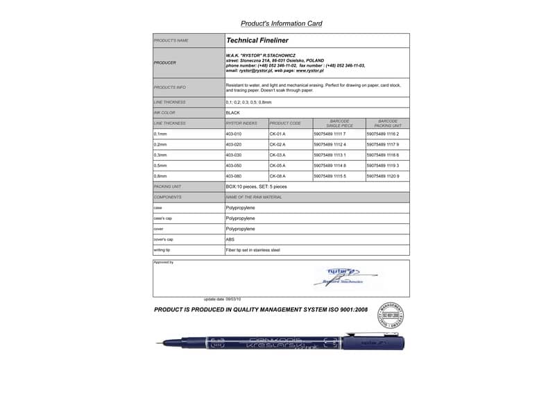 Penna a fibra per scrivere e disegnare. Punta in fibra sintetica con rinforzo in metallo. Inchiostro pigmentato resistente a luce e acqua, riproducibile in eliografia. Cappuccio con codice spessore e clip in metallo. Tratto 05 mm.