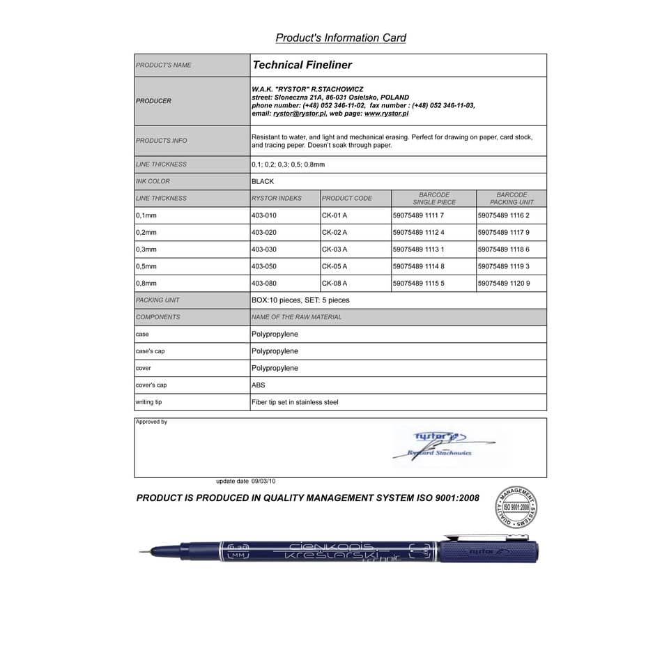 Penna a fibra per scrivere e disegnare. Punta in fibra sintetica con rinforzo in metallo. Inchiostro pigmentato resistente a luce e acqua, riproducibile in eliografia. Cappuccio con codice spessore e clip in metallo. Tratto 08 mm.