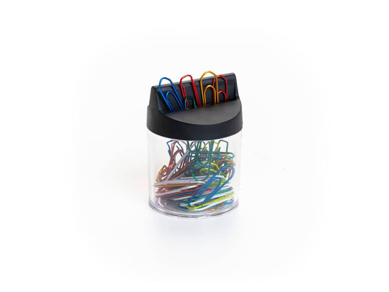 Fermagli colorati metallizzati N. 4 - Barattolo di plastica trasparente con dispenser magnetico da pz.60 - mm. 1,00 x 32 triangolari.