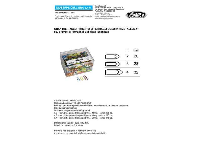 Fermagli Leone Gran Mix in filo colorato metallizzato misure assortite scatola da 500 g FX500GMIX