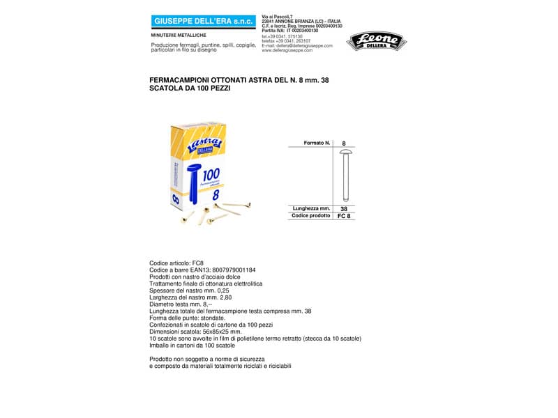 Fermacampioni ottonati ASTRA testa bombata N. 8 - Scatola di cartone da pz.100 - Lunghezza mm. 38. Fermacampioni prodotti con tranciatura e piegatura di precisione. Brillanti e protetti dalla ruggine da un'accurata ottonatura elettrolitica.