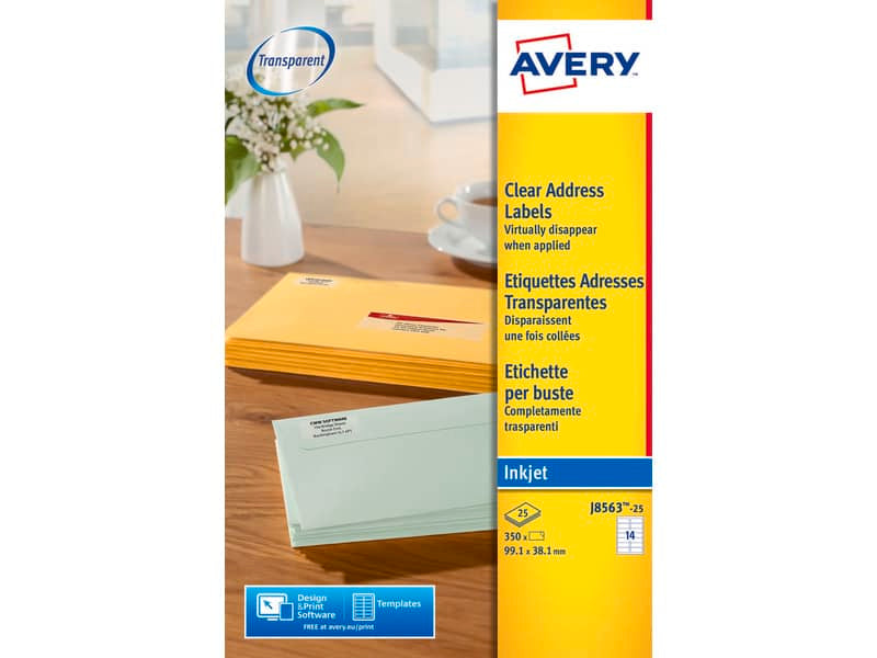 Etichette trasparenti opache in poliestere QuickPEEL™, per stampanti inkjet. Devi etichettare buste o pacchi colorati e vuoi che si differenzino da tutte le altre? Utilizza le etichette trasparenti per indirizzi per buste e pacchi. Una volta applicata l'etichetta su una busta o un pacco colorato questa risulta completamente invisibile, si vede solo ciò che vi è stampato sopra. Facili da stampare con il software e i modelli preimpostati gratuiti Avery Crea & Stampa. Formato 99,1x38,1 mm, 14 etichette per foglio, confezione da 25 fogli, 350 etichette per confezione. Facili da rimuovere e applicare grazie alla tecnologia QuickPEEL™ che libera un lato dell’etichetta e rende l’etichettatura più veloce. Adesivo permanente, perfetto per essere applicato su vetro, metallo, cartone e plastica. Finitura opaca, ideale per buste e pacchi colorati. La soluzione ideale per mettere in risalto messaggi importanti e dare un tocco professionale alle tue creazioni.