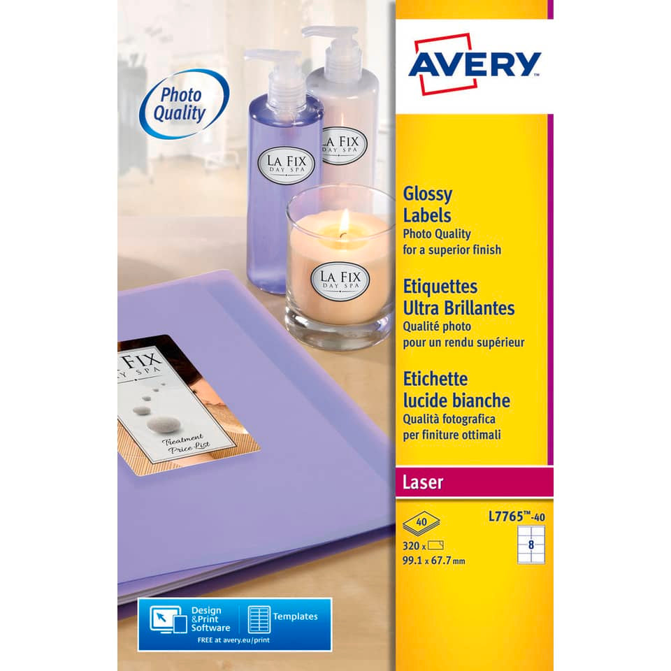 Etichette bianche lucide per stampanti Laser. Fai notare i tuoi prodotti con le etichette bianche lucide di Avery. Create per assicurare ottimi risultati di stampa con colori brillanti e testi nitidi. Comunica i valori del tuo marchio, le immagini e i messaggi in modo professionale con queste etichette, che possono essere utilizzate su prodotti, confezioni e materiali di marketing. Le etichette bianche lucide aderiscono su molte superfici, e se rimosse non lasciano residui di colla. Disponibili in diverse forme e materiali, per poter soddisfare tutte le tue necessità di etichettatura. Facili da stampare e personalizzare con il software e modelli gratuiti di Avery. Formato 99,1x67,7 mm, 8 etichette per foglio, confezione da 40 fogli, 320 etichette complessive per confezione. Ideali per etichettare prodotti fatti in casa e artigianali, e per dare un aspetto curato alla confezione. Stampe a colori di altissima qualità; per presentazioni, annunci, offerte speciali e stampe di immagini digitali. Perfette per chi opera nel settore delle consegne a domicilio, per chiudere le confezioni in modo pratico e sicuro. Indicate per la stampa di immagini digitali per dare maggiore risalto ai colori. Adesivo permanente, perfetto per vetro, metallo e plastica. Garantiscono colori brillanti e testi nitidissimi. Realizzate con carta certificata FSC® proveniente da foreste gestite in modo responsabile.