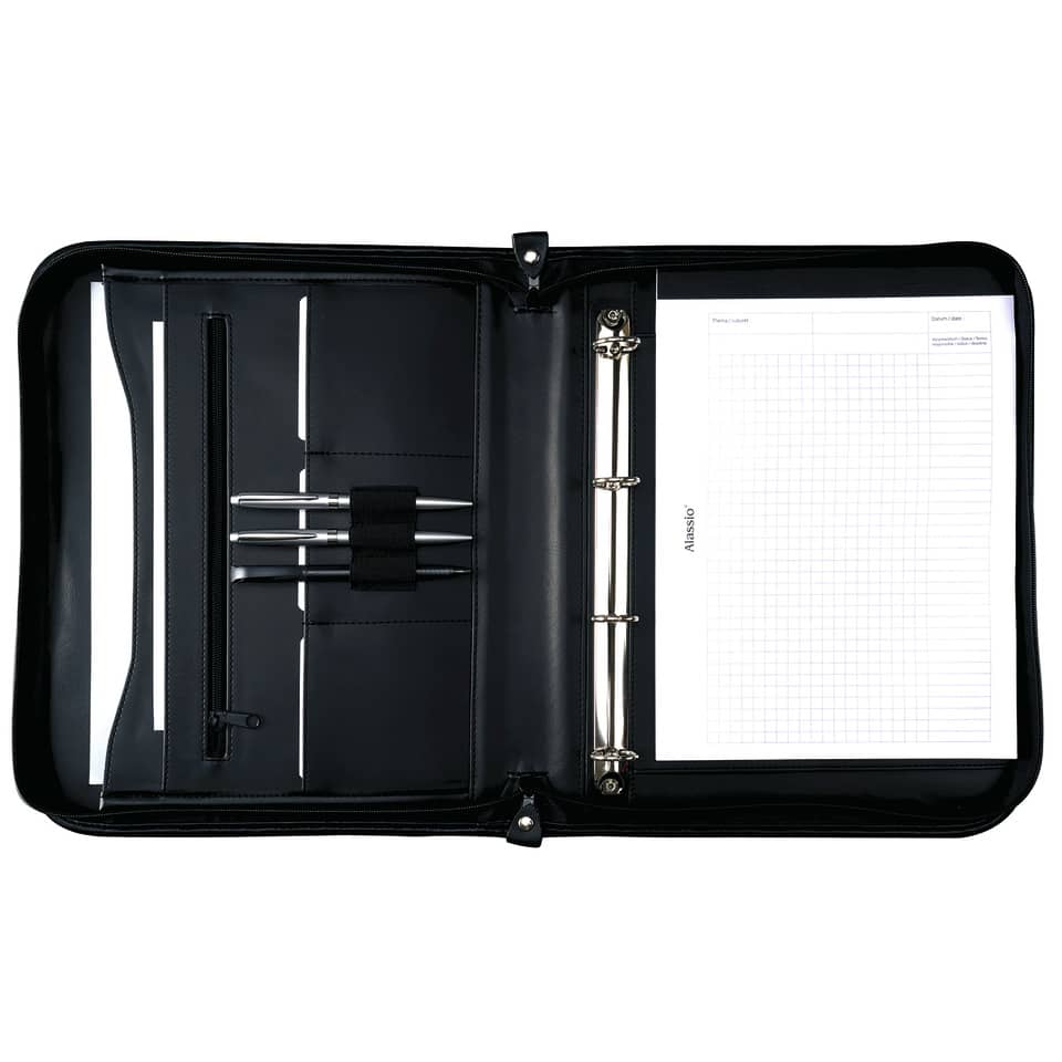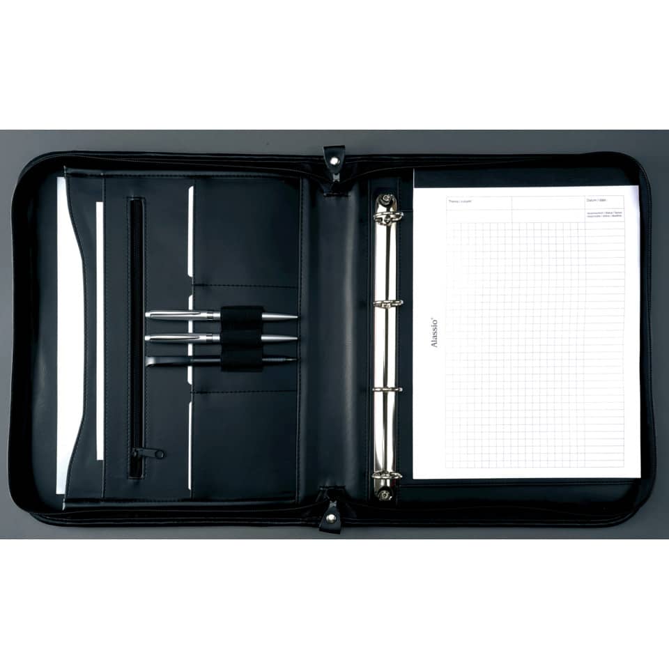 Cartella portadocumenti in vera pelle formato A4 con cerniera. Comprende un classificatore ad anelli rimovibile, uno scompartimento per blocchi in formato A4, tre scompartimenti, tre passanti portapenne e una tasca a cerniera frontale cerniera. Colore: nero.