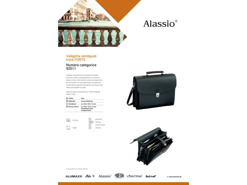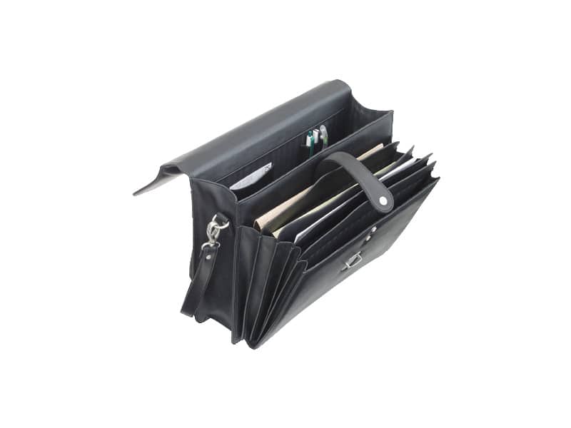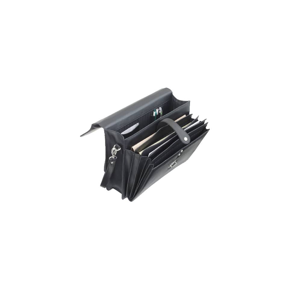 Valigetta ventiquattrore con tracolla removibile e chiusura a scatto, scompartimento con chiusura a lampo sul retro. Internamente: cinque scompartimenti per documenti, uno scompartimento principale che comprende tre passanti porta penne, scomparto porta iPad e porta biglietti da visita. Colore: nero.