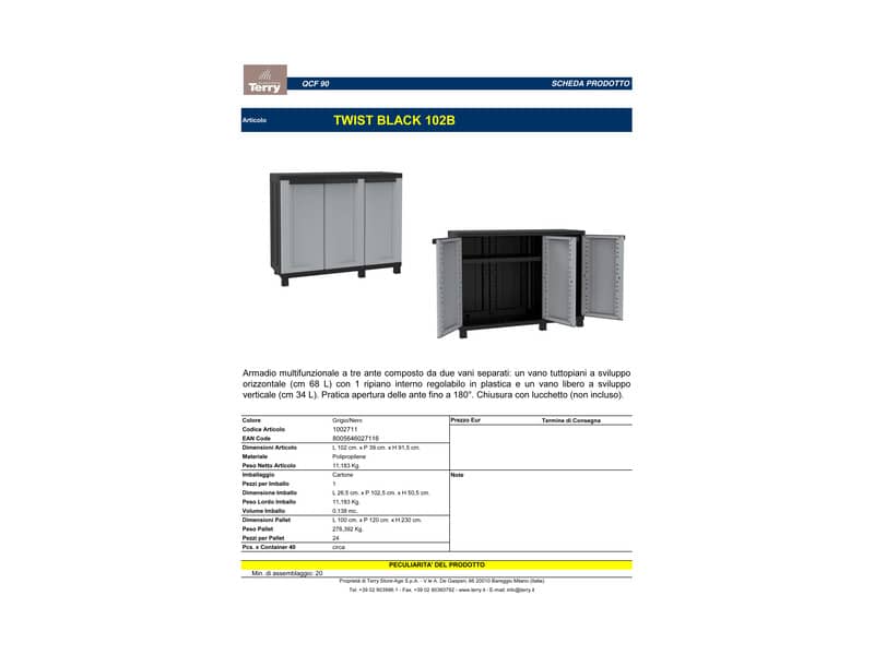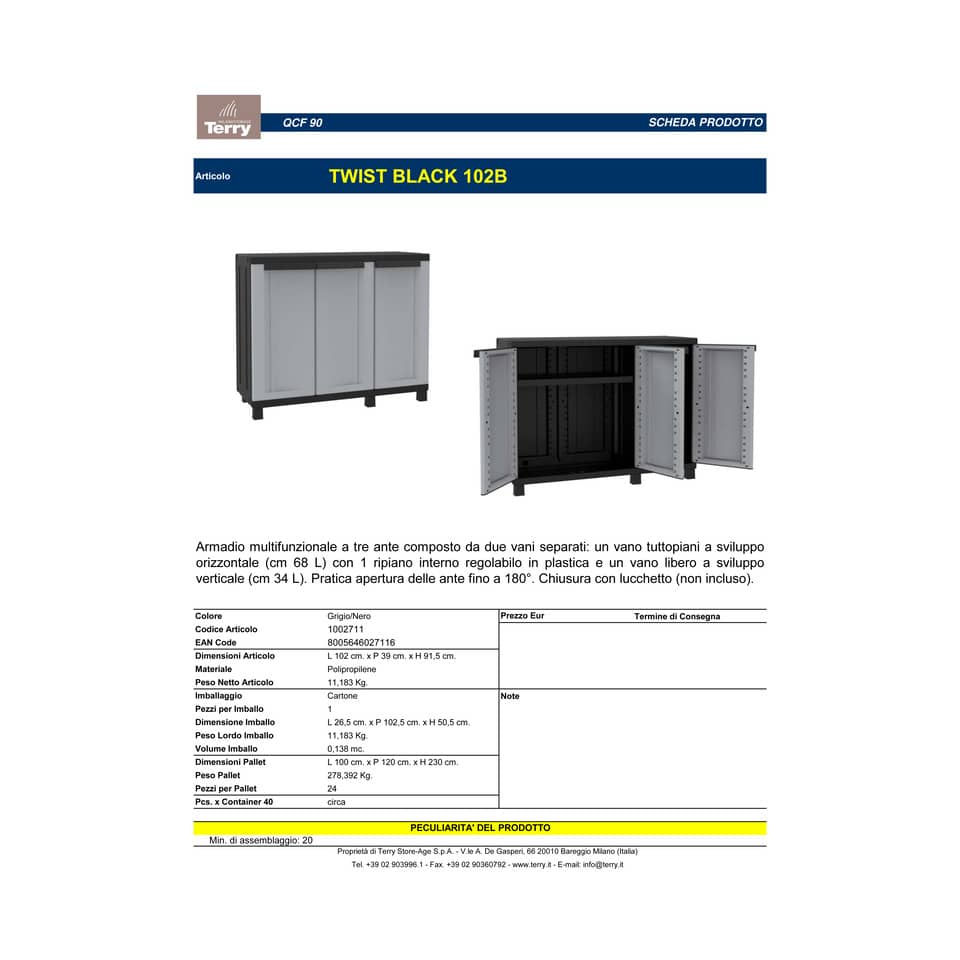 Armadio multifunzionale a tre ante composto da due vani separati: un vano tutto piani a sviluppo orizzontale (cm 68 L) con 1 ripiano interno regolabile in plastica e un vano libero a sviluppo verticale (cm 34 L). Pratica apertura delle ante fino a 180°. Chiusura con lucchetto (non incluso). Colore: grigio/nero.