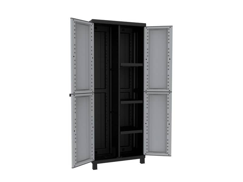 Armadio a 2 ante con divisorio verticale e 3 ripiani interni regolabili. Pratica apertura delle ante fino a 180°. Chiusura con lucchetto (non incluso). Colore: grigio/nero.