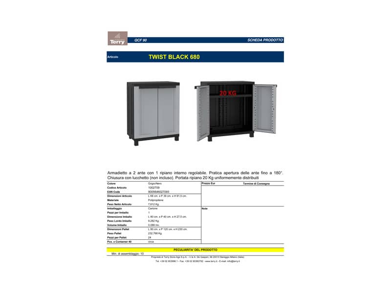 Armadietto a 2 ante con 1 ripiano interno regolabile. Pratica apertura delle ante fino a 180°. Chiusura con lucchetto (non incluso). Colore: grigio/nero.