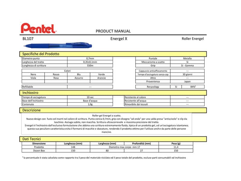 Roller a scatto ad inchiostro EnerGel colorato, punta 0,7 mm. Design giovane e accattivante con fusto e inserti nei colori di scrittura. Comoda grip in gomma antiscivolo. Massima precisione nel tratto. Taschina 4 pezzi colori assortiti (arancio/rosa/azzurra/viola) Prodotto realizzato con l'84% di materiale riciclato (percentuale calcolata escludendo le parti consumabili e/o di ricambio).