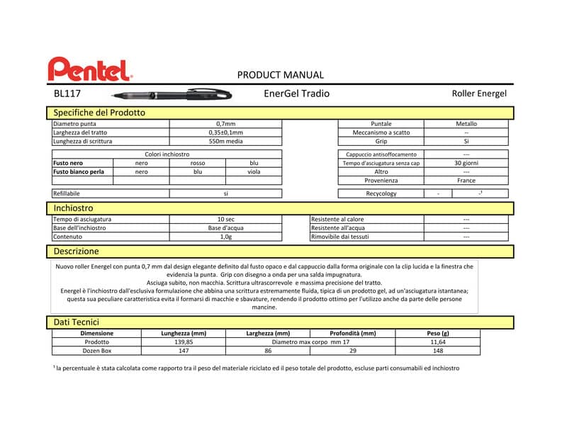 Penna roller a scatto Pentel Energel Tradio 0.7 mm bianco nero BL117W-A