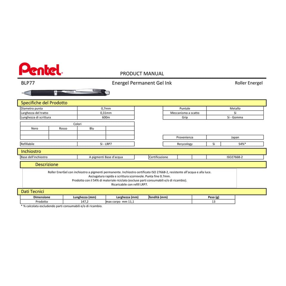 Roller EnerGel a scatto con punta 0,7mm, inchiostro a pigmenti permanente certificato ISO 27668-2. Perfetto per archiviazione, protegge i documenti nel tempo ed è resistente all'acqua e alla luce. Asciugatura rapida e scrittura scorrevole. Colore rosso. Ricaricabile con refill LRP7. Prodotto realizzato con il 54% di materiale riciclato (percentuale calcolata escludendo le parti consumabili e/o di ricambio).