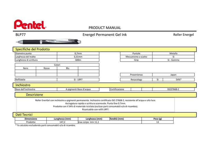 Roller EnerGel a scatto con punta 0,7mm, inchiostro a pigmenti permanente certificato ISO 27668-2. Perfetto per archiviazione, protegge i documenti nel tempo ed è resistente all'acqua e alla luce. Asciugatura rapida e scrittura scorrevole. Colore blu. Ricaricabile con refill LRP7. Prodotto realizzato con il 54% di materiale riciclato (percentuale calcolata escludendo le parti consumabili e/o di ricambio).