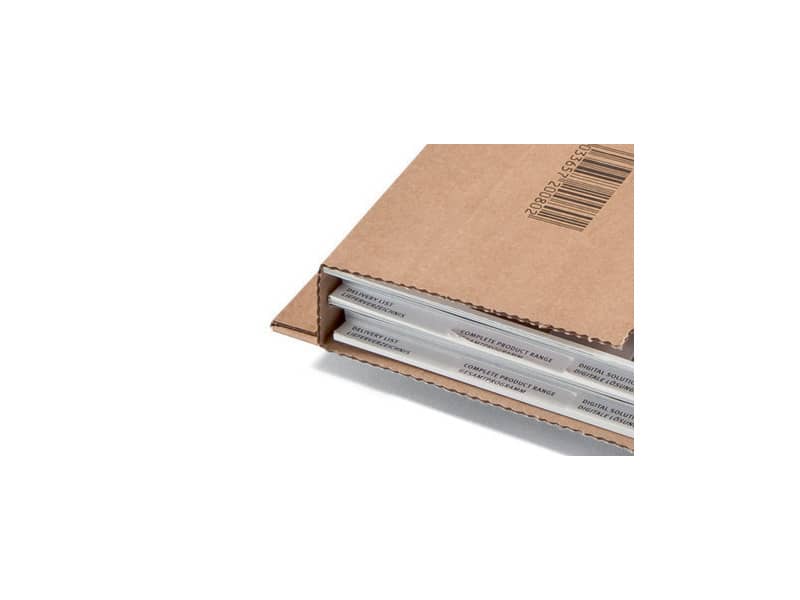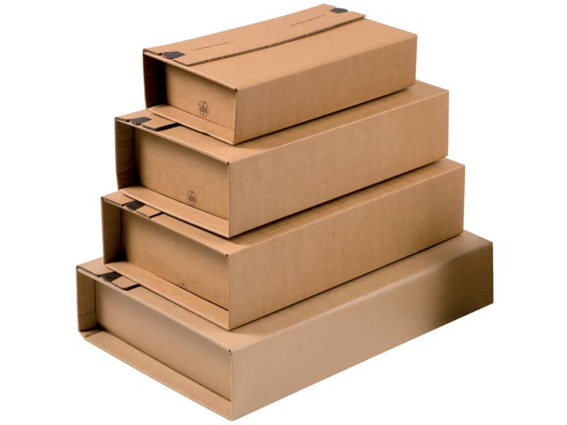 Scatola fustellata, altezza regolabile, angoli superprotetti, doppio bordo perimetrale. Altezza variabile da 55 a 80 mm. per adattarsi al contenuto. Misure esterne: 328 × 200 × -100.