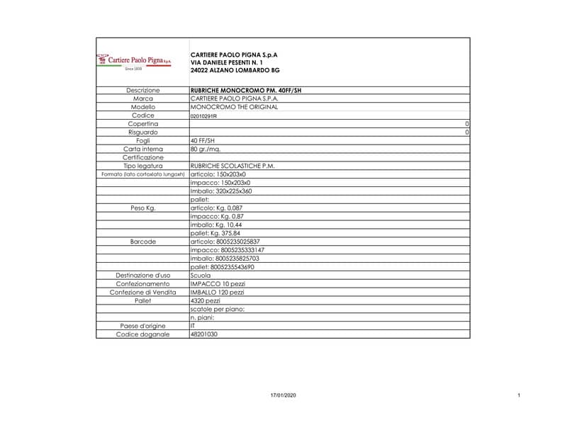 Rubrica punto metallico 40 fogli Pigna Monocromo A5 1R 02010291R