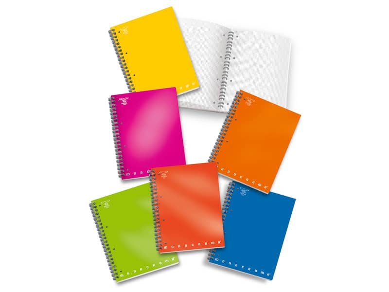 Blocchi a spirale con 4 fori, microperforazione e con copertina plastificata 240 g/mq con fori. Carta da 80 g/mq. 100 fogli. Colori assortiti.