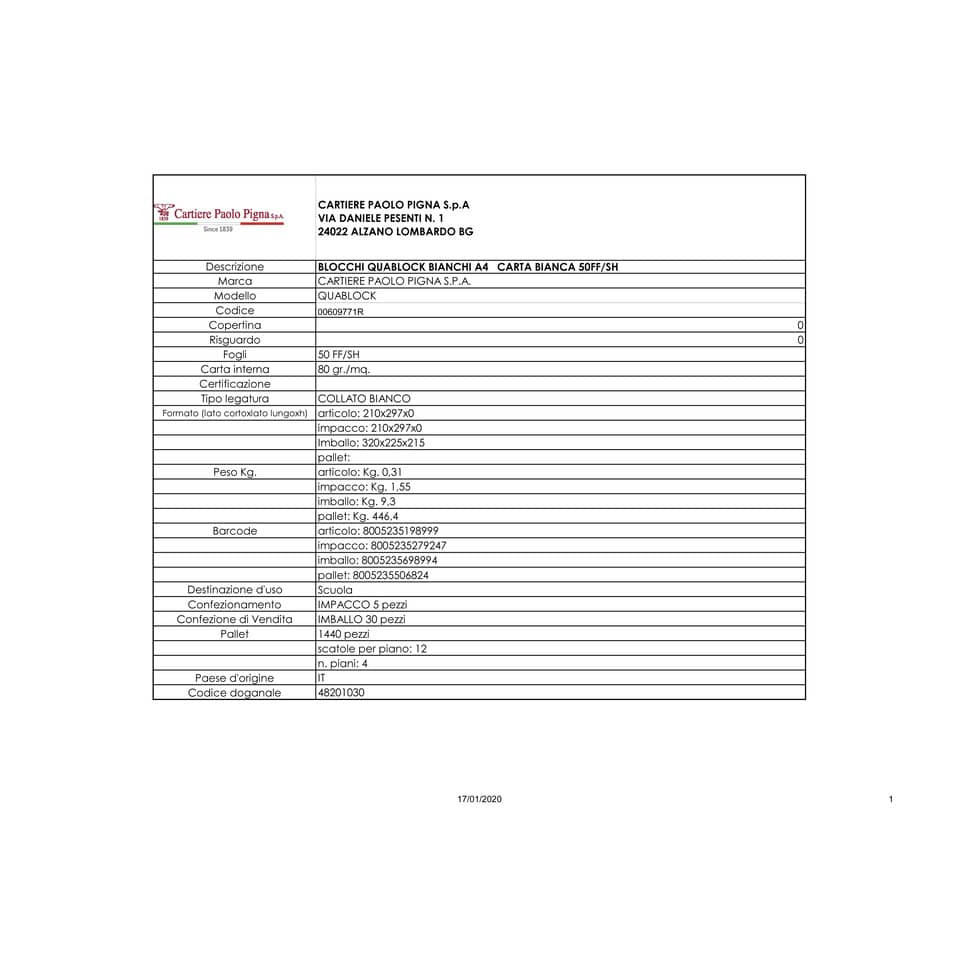 Blocco 50 fogli Pigna a 4 fori Quablock A4 1R 00609771R