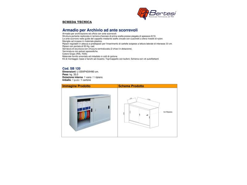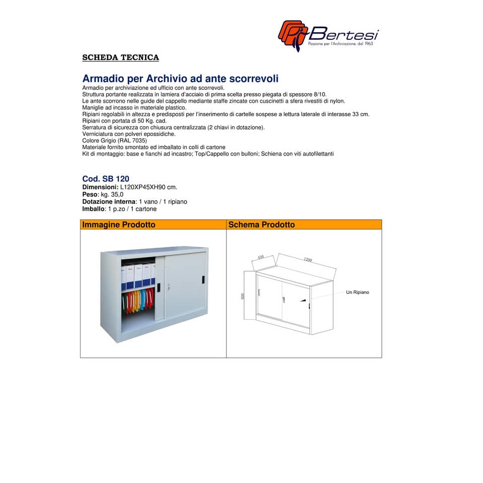 Armadio per archiviazione ed ufficio con porte scorrevoli KUBO. Struttura portante realizzata in lamiera d’acciaio di prima scelta presso piegata di spessore 8/10. Le ante scorrono nelle guide del cappello mediante staffe zincate con cuscinetti a sfera rivestiti di nylon. Maniglie ad incasso in materiale plastico. Ripiani regolabili in altezza e predisposti per l’inserimento di cartelle sospese a lettura laterale di interasse 33 cm. Ripiani con portata di 50 kg cad. Serratura di sicurezza con chiusura centralizzata (2 chiavi in dotazione). Verniciatura con polveri epossidiche. Colore: grigio (RAL 7035). Nr. vani: 1. Nr. ripiani: 1. Materiale fornito smontato ed imballato in colli di cartone.