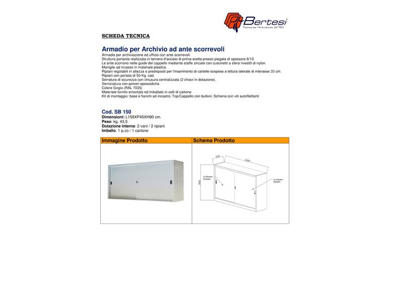 Armadio per archiviazione ed ufficio con porte scorrevoli KUBO. Struttura portante realizzata in lamiera d’acciaio di prima scelta presso piegata di spessore 8/10. Le ante scorrono nelle guide del cappello mediante staffe zincate con cuscinetti a sfera rivestiti di nylon. Maniglie ad incasso in materiale plastico. Ripiani regolabili in altezza e predisposti per l’inserimento di cartelle sospese a lettura laterale di interasse 33 cm. Ripiani con portata di 50 kg cad. Serratura di sicurezza con chiusura centralizzata (2 chiavi in dotazione). Verniciatura con polveri epossidiche. Colore: grigio (RAL 7035). Nr. vani: 2. Nr. ripiani: 2. Materiale fornito smontato ed imballato in colli di cartone.