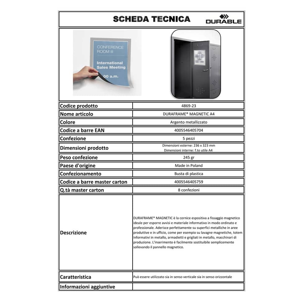 Cambia abitudine, esponi con stile!DURAFRAME® MAGNETIC è la cornice espositiva a fissaggio magnetico ideale per esporre avvisi e materiale informativo su superfici metalliche. Presentazione ordinata e professionale di avvisi e materiale informativo. L'inserto è facilmente sostituibile semplicemente sollevando il pannello magnetico. Aderisce perfettamente su superfici metalliche in aree produttive e in ufficio, come per esempio su lavagne magnetiche, totem informativi in metallo, armadietti e grigliati in metallo, macchinari di produzione. Per esporre documenti f.to A4. Utilizzabile sia in posizione verticale sia in orizzontale. Dimensioni esterne: 236 x 323 mm.