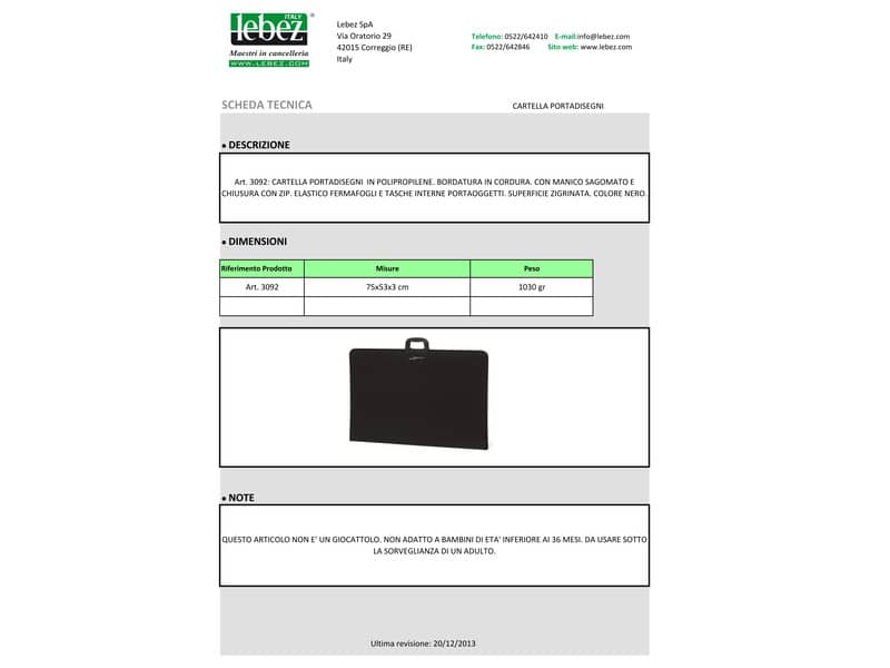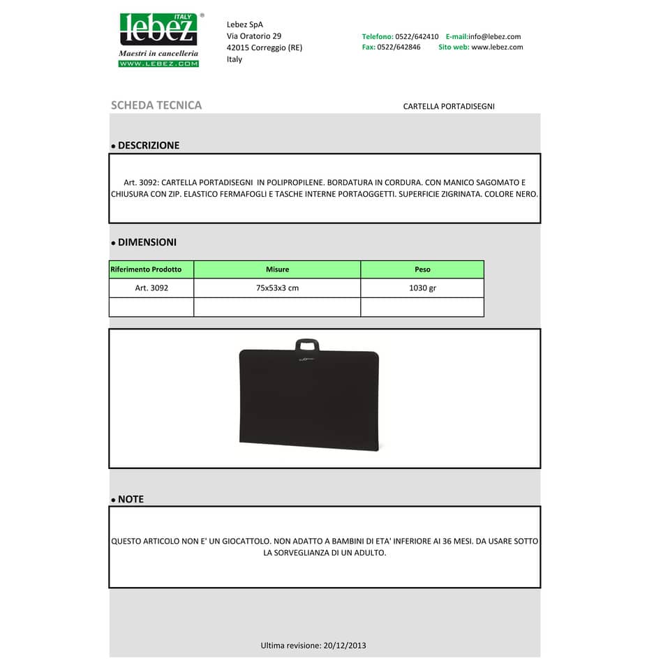 Cartella portadisegni in polipropilene con bordature in cordura. Manico Sagomato. Elastico Fermafogli. Tasche Interne portaoggetti. Dimensioni 75X53X3 cm.