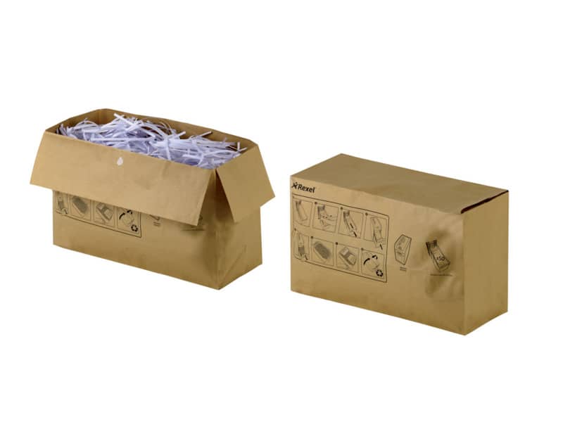 Sacchetti per distruggidocumenti riciclabili. Una volta pieni, è sufficiente sigillare i sacchetti usando la striscia autoadesiva e posizionarli esternamente per la raccolta. Capacità: 34L.