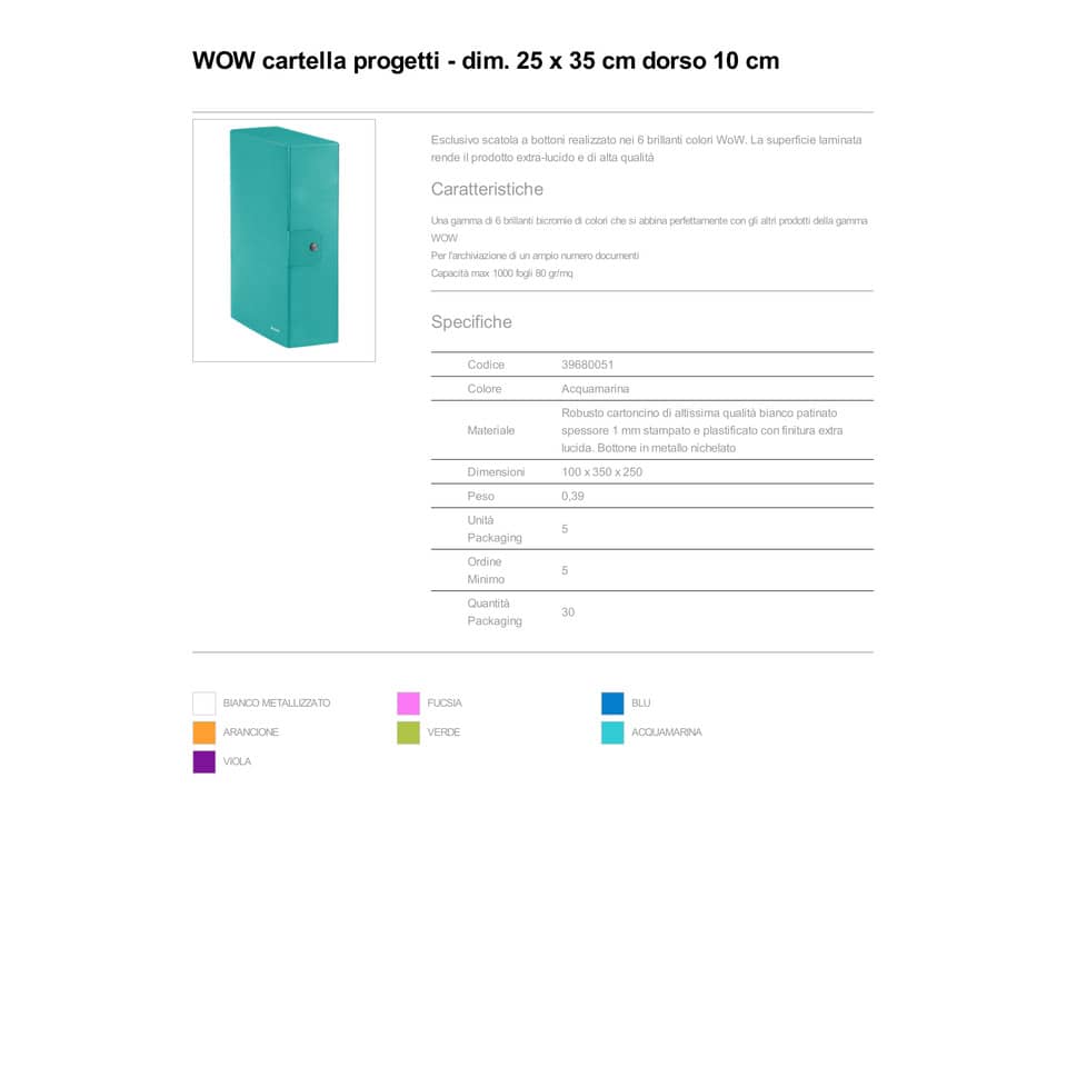 Scatola portaprogetti Leitz WOW in cartone - dorso 10 cm - formato 25x35 cm acqua marina metallizzato - 39680051