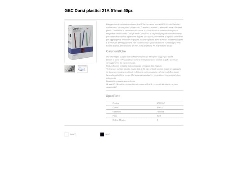 Rilegare non è mai stato così semplice! È facile capire perché GBC CombBind sia il nostro dorso per rilegatura più venduto. Che siano manuali o relazioni interne, Gli anelli plastici CombBind vi permettono di creare documenti con un sistema di rilegatura elegante e modificabile. Con gli anelli CombBind le pagine si piegano completamente per essere fotocopiate e prendere appunti con facilità; i documenti si aprono facilmente per aggiungere o rimuovere le pagine. Gli anelli plastici sono durevoli, resistenti ai graffi e a eventuali danneggiamenti, non scoloriscono e possono essere riutilizzati più volte. Colore: bianco. Dimensione: 51 mm. Fino al formato A4. Confezione da: 50.