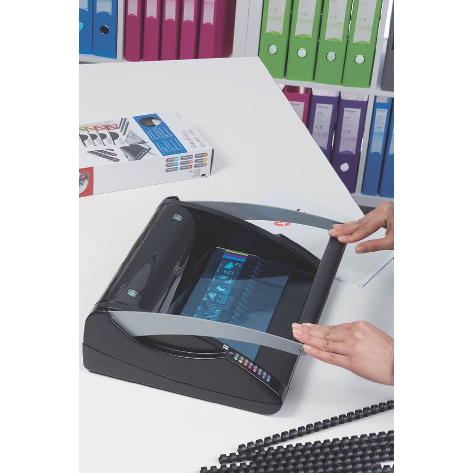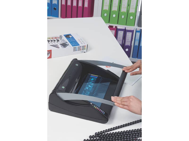 Rilegare non è mai stato così semplice. CombBind® C200 è ideale per volumi medi ed un uso condiviso. Combina una capacità di perforazione fino a 20 fogli da 80 g/mq con una capacità di rilegatura fino a 330 fogli con dorsi da 38 mm. Grazie agli esclusivi indicatori di allineamento del foglio e ad una perforazione senza sforzo, rilegare documenti è più semplice che mai. Scegli i dorsi con codice cromatico ProComb per una massima produttività. CombBind®, il sistema classico per rilegare. Garanzia 2 anni. Dimensioni LxPxH: 34x39,5x13 cm.