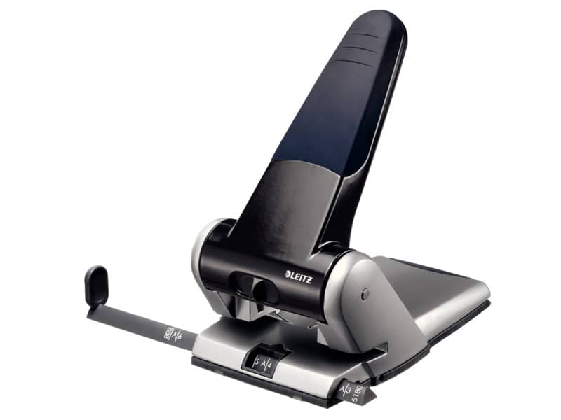 Perforatore robusto e affidabile. La forma ergonomica e gli inserti in gomma ''Soft Grip'' consentono una presa sicura e uno sforzo di perforazione ridotto. Dotato di fermo per bloccare la leva in posizione abbassata riducendone l'ingombro quando non utilizzato. La base e la maniglia sono in alluminio pressofuso. Copertura inferiore in gomma antiscivolo. Colore: nero.