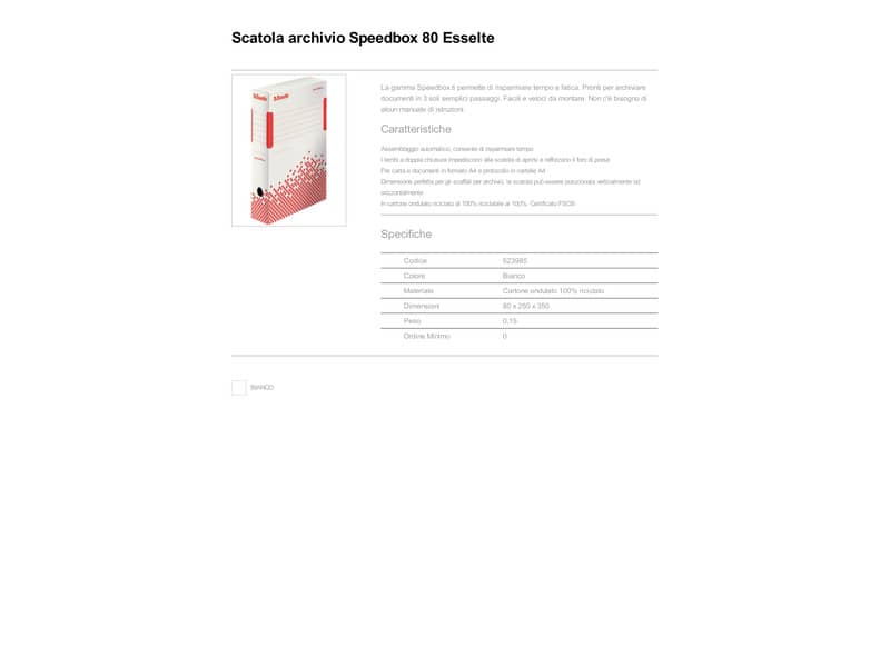 La gamma Speedbox ti permette di risparmiare tempo e fatica. Pronti per archiviare documenti in 3 soli semplici passaggi. Facili e veloci da montare. Non c'è bisogno di alcun manuale di istruzioni. Assemblaggio automatico. Larghezza dorso 80 mm. Per i formati A4 e protocollo. Colore: bianco.
