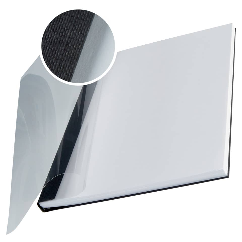 Copertina flessibile con parte anteriore trasparente per design personalizzati. Con struttura in lino nella parte posteriore e copertina anteriore trasparente. Capacità 70-105 fogli. Formato A4. Colore: nero.