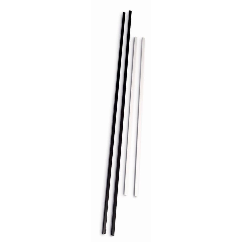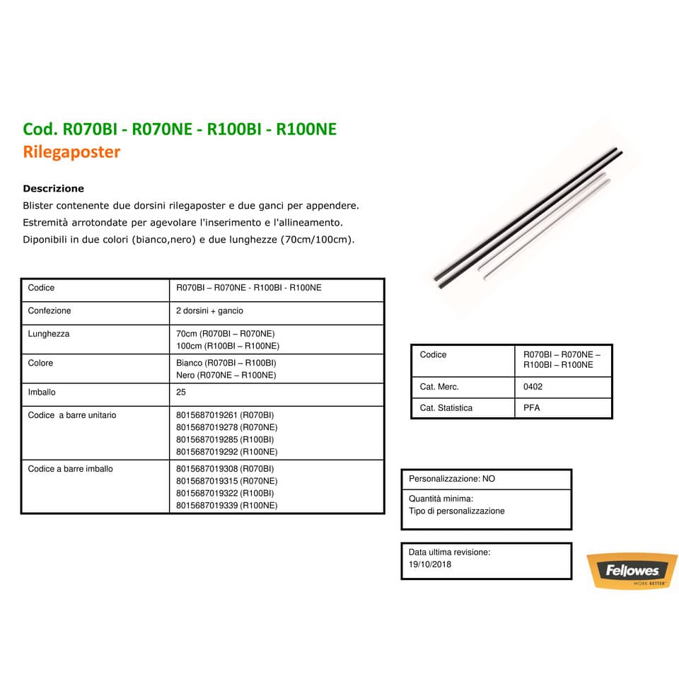 Blister contenente due dorsini rilega poster e due ganci per appendere. Estremità arrotondate per agevolare l'inserimento e l'allineamento. Lunghezza 70 cm. Colore: bianco.