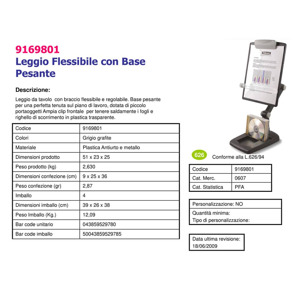 Leggio FELLOWES snodabile con base pesante plastica grafite capacità 150 fogli - 9169801