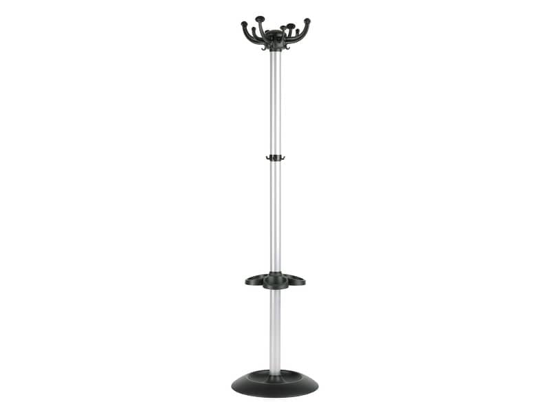 Appendiabiti da terra con portaombrelli provvisto di 8 appendini e 4 ganci. Struttura in metallo verniciato con polveri epossidiche. Basamento in polipropilene nero. Manicotto portachiavi con 4 punti di aggancio. Altezza 176 cm, diametro base 40 cm. Colore: grigio.