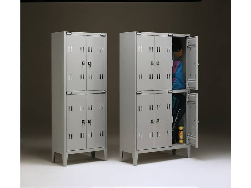 Spogliatoio Technical 2 sovrapposto a 4 posti. Struttura in acciaio 7/10 monoblocco verniciata. Antine montate su cerniere interne antiscasso, dotate di feritoie di aerazione. Chiusura con scrocco metallico lucchettabile.