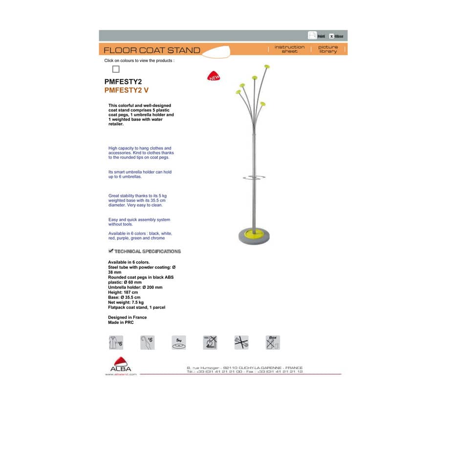 Appendiabiti in metallo verniciato grigio alluminio, è dotato di 5 pomoli in legno verdi, un portaombrelli (da 6) e una base appesantita da 5 kg con vaschetta in ABS grigio alluminio per raccogliere l'acqua. Diametro colonna 3,8 cm. Altezza 175 cm. Base Ø 35 cm.