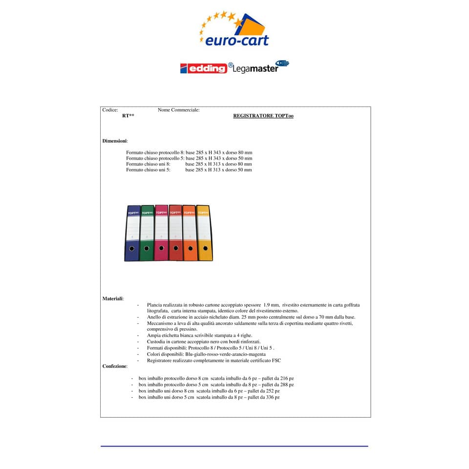 Plancia realizzata in robusto cartone accoppiato spessore 2 mm, rivestito esternamente in carta goffrata litografata, carta interna stampata, identico colore del rivestimento esterno. Anello di estrazione in acciaio nichelato diam. 25 mm posto centralmente sul dorso a 70 mm dalla base.Meccanismo a leva di alta qualità ancorato saldamente sulla terza di copertina mediante quattro rivetti, comprensivo di pressino.Ampia etichetta bianca scrivibile stampata a 4 righe.Custodia in cartone accoppiato nero con bordi rinforzati.Registratore realizzato completamente in materiale certificato FSC. Formato chiuso protocollo 5: base 285 x H 343 x dorso 50 mm