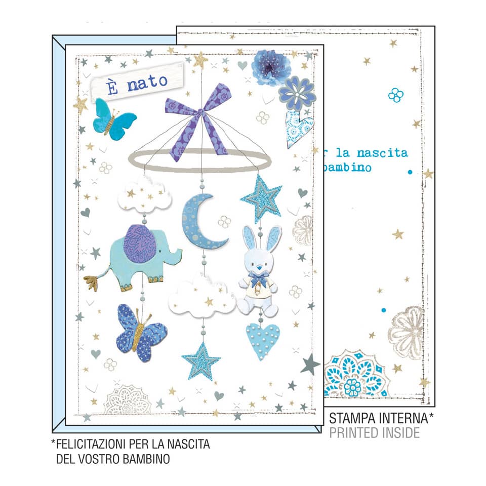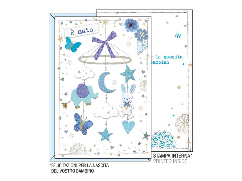 Biglietti augurali Kartos "Nascita" giostrina azzurra e argento con rilievo 17802601A