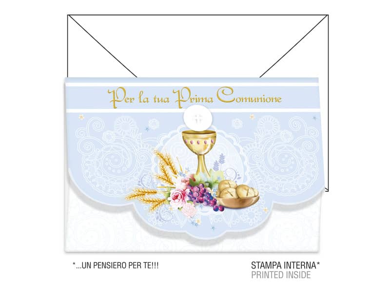 Biglietti porta soldi prima comunione cm 11,7x17 con glitter, realizzati su cartoncino bianco liscio, 6 pz in blister blisterati 1 busta/1 biglietto