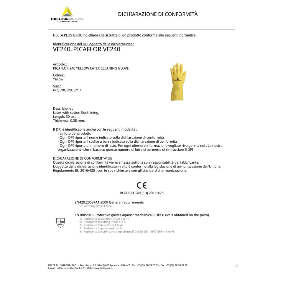 Guanti casalinghi giallo PICAFLOR 240. Lattice floccato cotone. Lunghezza : 30 cm. Spessore : 0,38 mm.Supporto: 100% lattice naturale. Floccatura : 100% cotone. Idonei ad uso alimentare, compatibili con cibi secchi, umidi e grassi. Testati conformemente alla norma EN374-3:2003.
