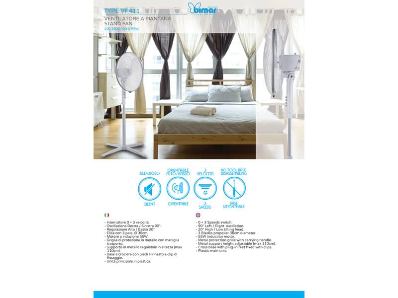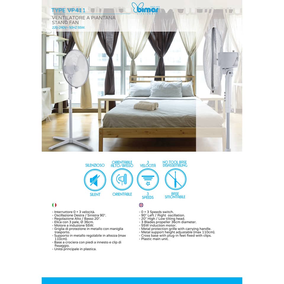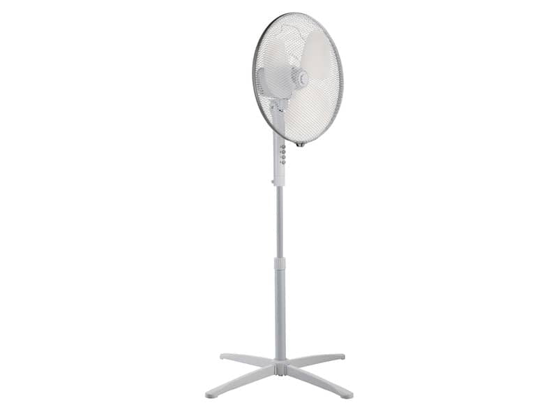Ventilatore a Piantana - diametro 40 cm, altezza 120cm, colore bianco, griglia nido d'ape, 3 velocità, 3 pale in polipropilene, cavo 1,5mt, potenza 45w, Alimentazione 230V ~ 50Hz. Base a croce. 3 velocità. Motore CCA, dimensioni 66 x 12 mm. Funzione oscillazione.