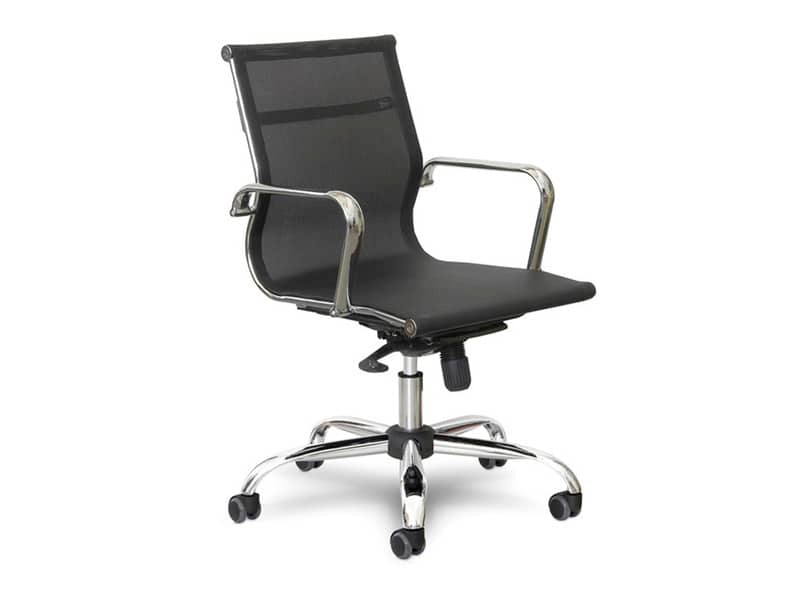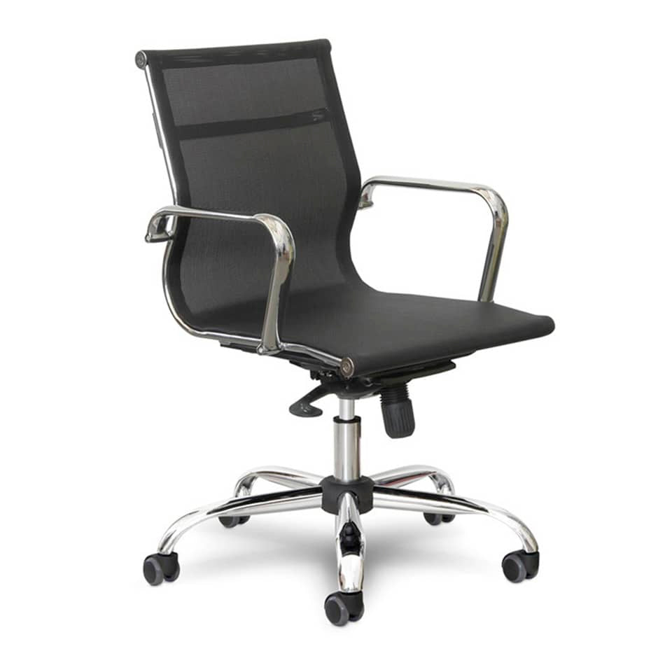 Poltrona direzionale girevole Pollux Space PXD, struttura portante in rete, base in acciaio tubolare, schienale basso e fisso. Seduta con elevazione a gas, meccanismo oscillante con blocco. Pollux Space, una poltrona tecnologicamente avanzata con seduta e schienale in rete metallica ergonomica e traspirante, di colore nero.