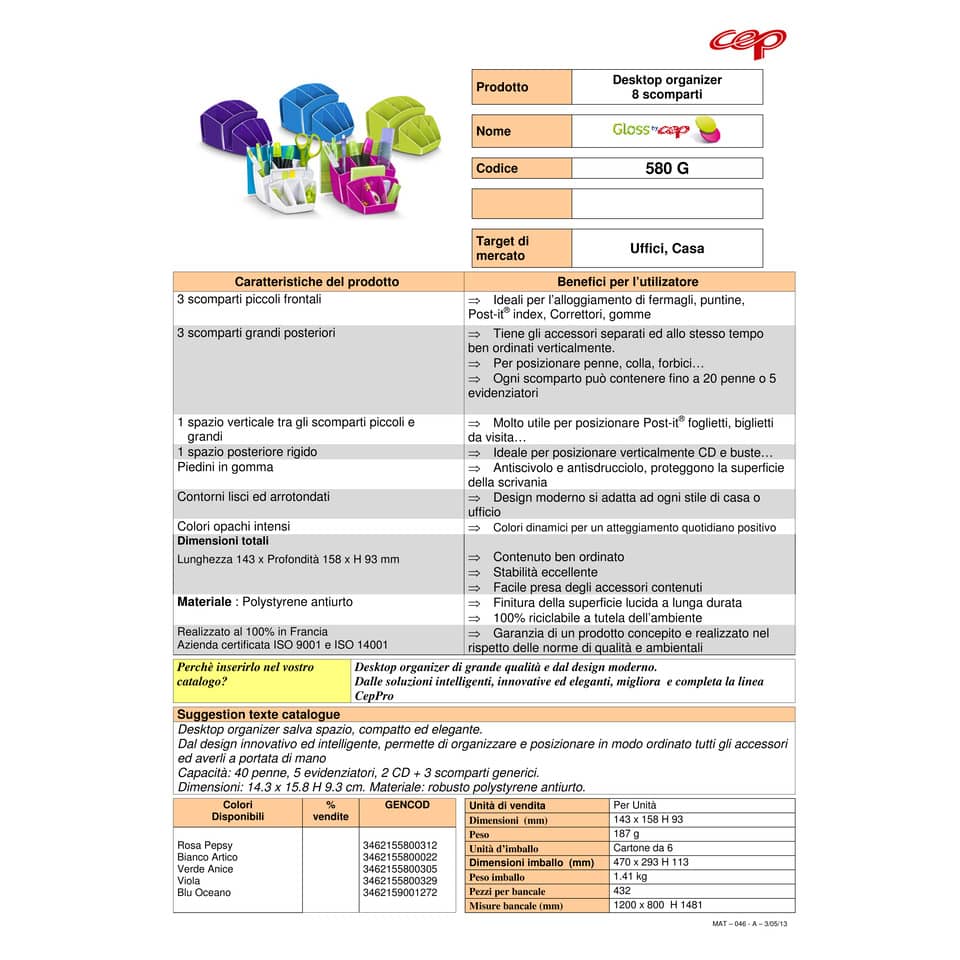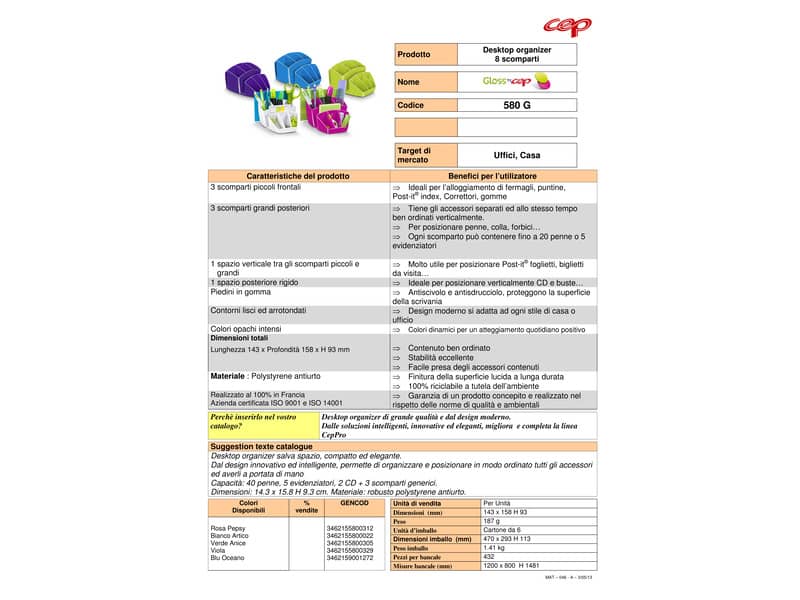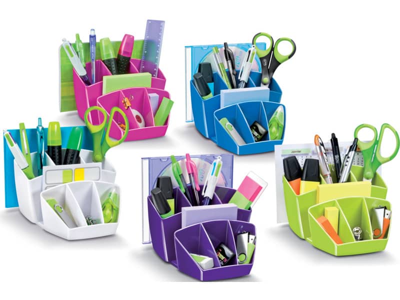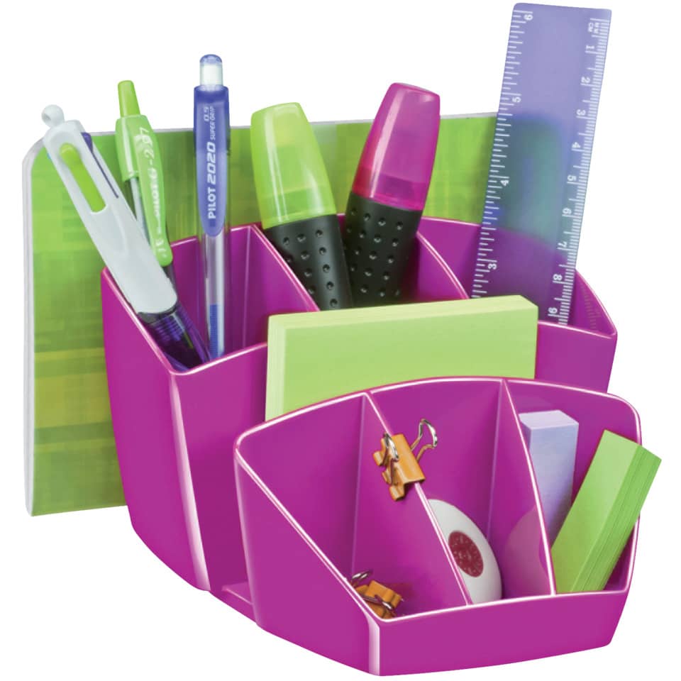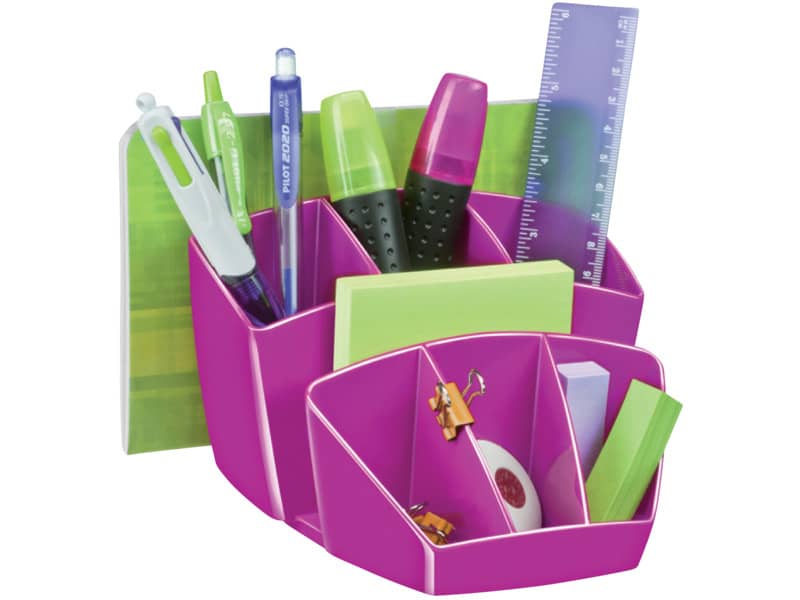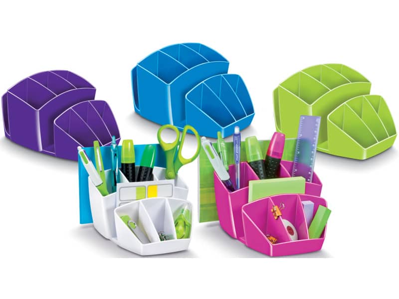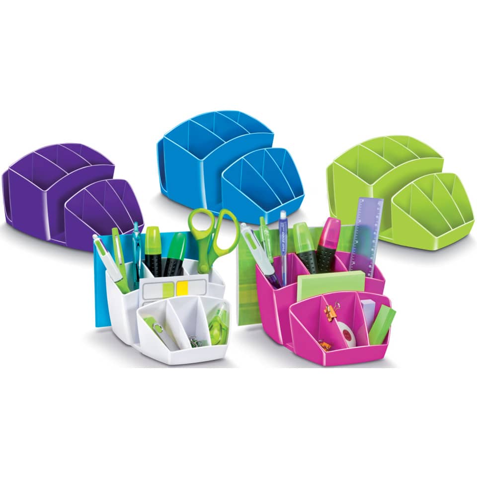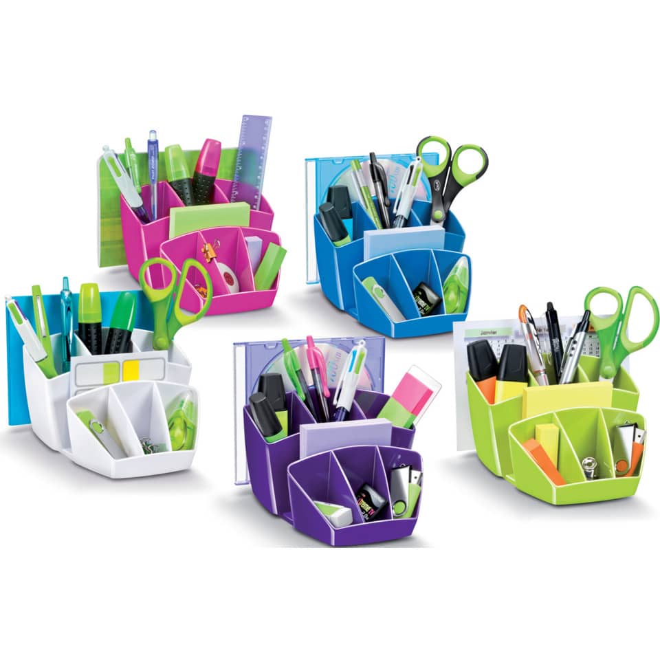 Desktop organizer salva spazio, compatto ed elegante.Dal design innovativo ed intelligente, permette di organizzare e posizionare in modo ordinato tutti gli accessori ed averli a portata di manoCapacità: 40 penne, 5 evidenziatori, 2 CD + 3 scomparti generici.Dimensioni: 14.3 x 15.8 H 9.3 cm. Materiale: robusto polystyrene antiurto.